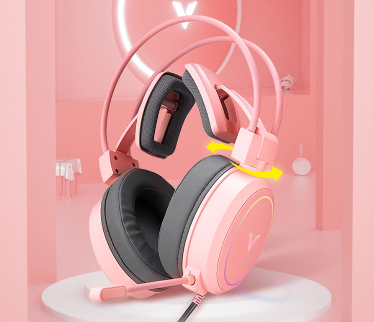 雷柏VH610游戏耳机采用比较简洁的设计,拥有清滢粉和流光银两种颜色可选,相信女玩家会非常喜欢清滢粉配色。在耳机两侧都拥有灯圈和会发光的“V”字LOGO,更加个性。耳机两侧的RGB呼吸灯点亮后,视觉效果比较炫酷,能够打造出不错的电竞氛围。
