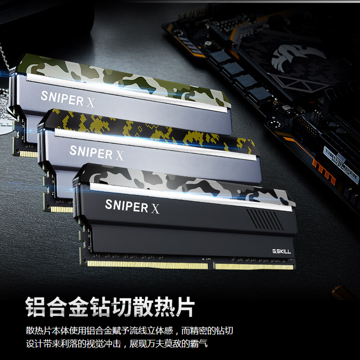 X狙击者系列内存是令电竞玩家、电脑改装爱好者为之兴奋的高性价比选择。其采用了迷彩图腾的理念,上盖以数位印呈现细致的野战迷彩图腾。散热片使用铝合金材质,多层结构赋予了流线立体感,而钻切设计则带来高贵利落的视觉冲击。奔放不羁又不失内敛的霸气,势将狙击玩家内心深处的热血电竞魂。Sniper