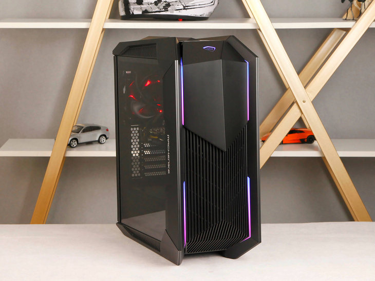 机械师F117-V76r1游戏主机采用了全塔机箱,黑色外观涂装,造型的设计灵感来源于科幻电影当中的未来战舰,整体上非常犀利有型,相当具有视觉冲击力。机箱前脸设计了四条RGB灯带,采用两两对称式布局,在电脑运行时能够显现迷人的RGB灯效,令这款“未来战舰”看上去更具科技美感。