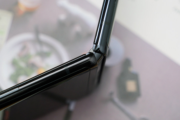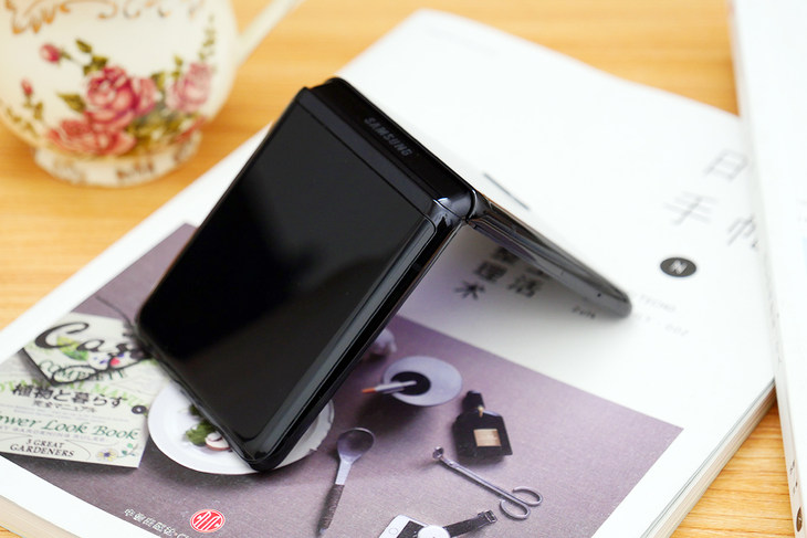 下面要说到的就是手机的折叠转轴部分,三星Galaxy Z Flip的转轴并不像三星Galaxy Fold那样是需要一步到位的,而是带有阻尼感,能够停留在任何角度,这样的设计也让三星Galaxy Z Flip有了更多的应用场景。