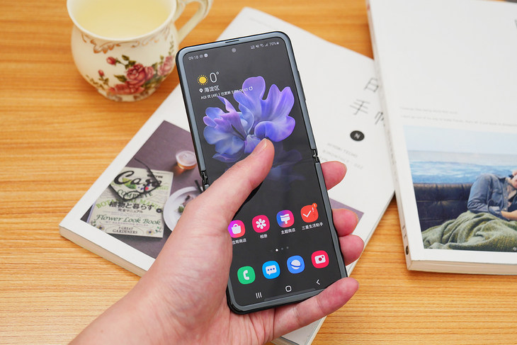 单手展开三星Galaxy Z Flip还是比较费劲的,因为转轴阻尼较大,所以需要一定的力量才能打开。