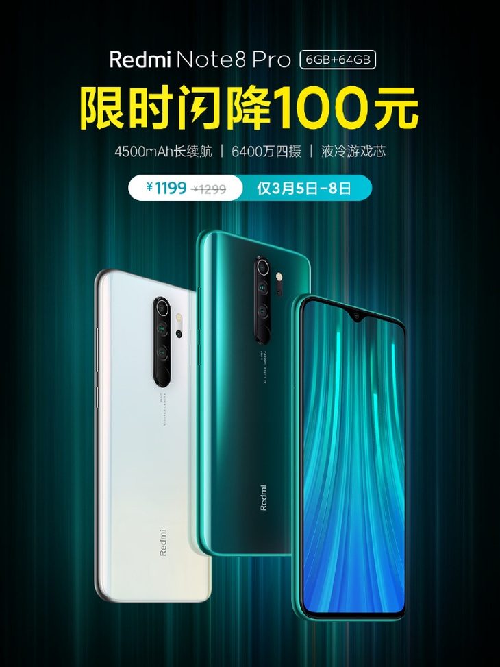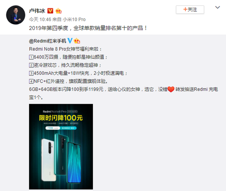 3月5日消息,今日@Redmi红米手机 官方微博发布消息称,Redmi Note 8 Pro将参与今年的购物女神节,6GB+64GB版本闪降100元,到手价仅为1199元。随后,红米Redmi品牌总经理@卢伟冰 转发该条微博,并表示,Redmi Note 8 Pro是一款荣获了2019年第四季度全球单款销量排行榜第十名的产品。