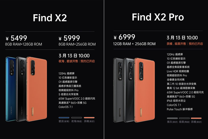OPPO Find X2系列目前开始接受预定,其中OPPO Find X2 8GB+128GB 售价5499元,8GB+256GB售价5999元。而OPPO Find X2 Pro 12GB+256GB 售价6999元,将会在3月13日10:00正式开启首销。
