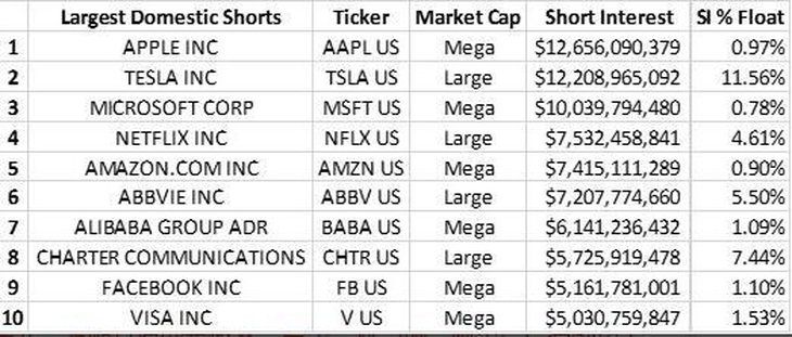 据了解,目前苹果的未平仓空头头寸市值达126.56亿美元,超越特斯拉的122.09亿美元。微软则达到了100.39亿美元位列第三,奈非、亚马逊、艾伯维以及阿里巴巴分别以75.32亿美元、74.15亿美元、72.07亿美元和61.41亿美元紧随其后。