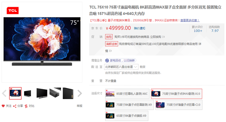 TCL 75X10>>49999元>>购买链接