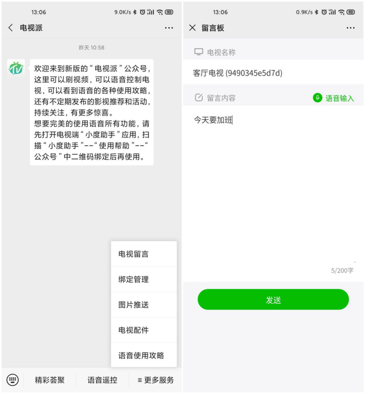 创维A4还支持家庭留言板功能,在公众号电视派中,我们可以使用手机可以给家里的电视发送信息,这样可以让家人更便捷的查看信息内容,打通了手机与电视之间的信息交互。