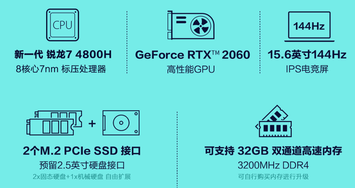 天选游戏本除了这次带来了非常香的售价外,本身强悍的综合配置更是吸睛。搭载了AMD全新一代8核16线程的锐龙7 4800H标压处理器,7nm先进工艺同时还采用了最新的Zen2架构,性能有了显著提升。