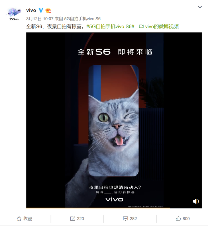 自拍方面毫无疑问是vivo S系列的重点,vivo S6在夜景自拍上进行了升级优化。根据官方公布的预热视频,即使是在暗光下,视频中喵星人的毛发胡须等细都能清晰还原,相信这次vivo S6在夜景自拍上会给我们带来很大的惊喜。