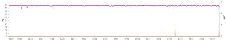首先是王者荣耀最高画质的测试,结果和想象中的一样全高画质60FPS几乎全程满帧运行。测试软件生成的帧率曲线非常平直,综合帧率结果也是无限接近满帧。游戏本身的体验来说也是没有出现丝毫感知层面的卡顿。