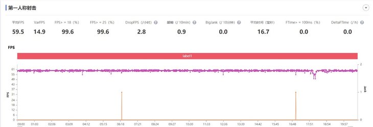 和平精英HDR高清画质全开下,测试软件给出的结果是平均59.5FPS,这个数据就是非常出色了,而且从波动曲线来看整体也是非常稳定,游戏测试过程中也没有出现可感知的卡顿,而且过程中温度控制的也很理想,没有出现局部过热导致性能下降的情况。要知道这可是60帧版本的和平精英,一般普通下载的版本都是30帧。