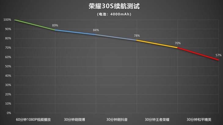荣耀30S配备了一块4000mAh的大电池,以下是泡泡网标准续航测试。30分钟王者荣耀、30分钟和平精英、30分钟抖音、30分钟微博、一小时1080P在线视频播放共三小时的中高强度测试后,剩余电量为57%,正常强度使用可以连续亮屏7-8小时,保证一整天的续航还是非常轻松的。