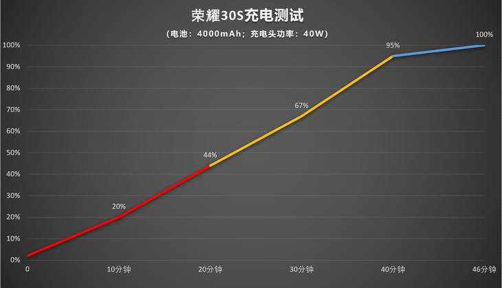 荣耀30S配备了一颗40W的大功率充电器,你没有看错的确是40W的超级快充并且得到莱茵认证,恐怕这点要让很多优异旗舰都要羡慕了。实际测试下来30分钟充电67%,40分钟充电95%,46分钟充满。结合荣耀30S的整体续航表现,日常充半小时电差不多就能中度使用一天。如果是重度用户充满的话,用一天压力也不大。