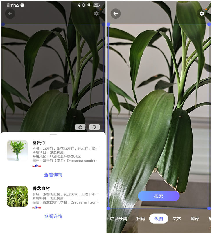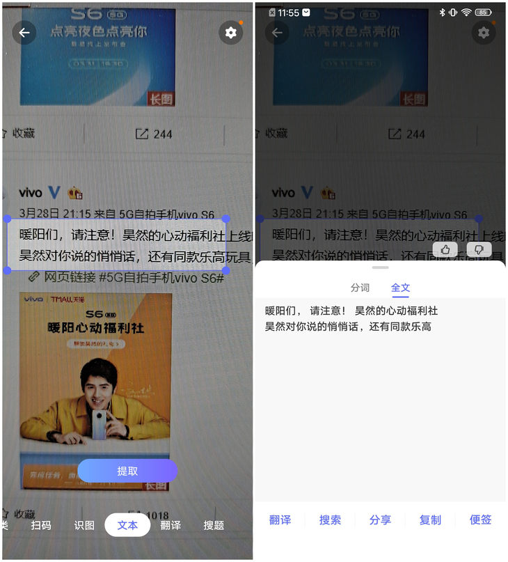得益于vivo S6的AI性能,手机搭载了新一代的试图功能,除了名人、植物、动物等上一代的识别功能外,vivo S6还新增了文本模式,可以识别图片中的文本内容,并且可以将文字提取,非常的方便。