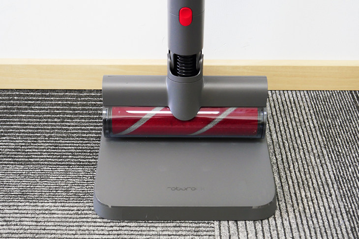 首先是地毯,因为地毯带有非常细密的褶皱,因此更容易藏污纳垢,并且非常考验吸尘器的吸力。我们选择了大吸力的模式,来应对地毯的清理。