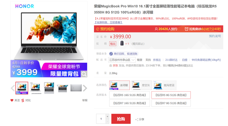 4月1日,荣耀正式开启全球宠粉节,其中荣耀MagicBook Pro锐龙版直降700元,迎来史上最低价,仅需3999元即可入手,另有价值199元的双肩背包赠送。
