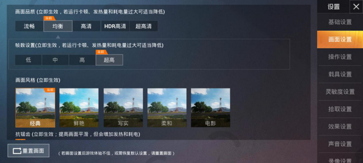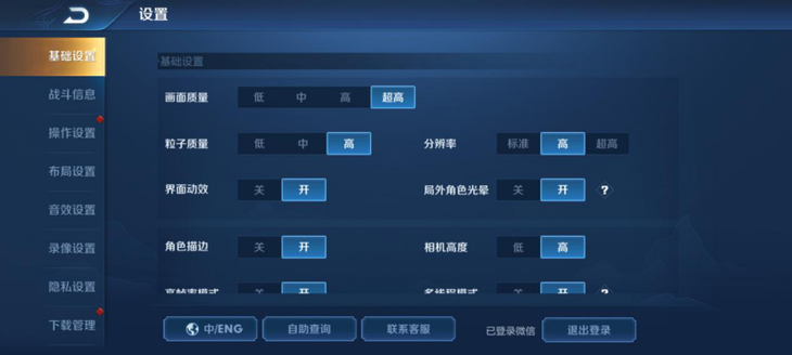 我们将《王者荣耀》的设置调整为高帧率模式,游戏设置如图所示。