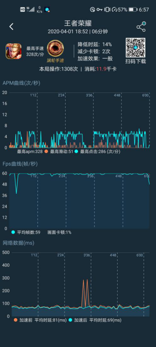 通过腾讯手游加速器可以看到,使用荣耀30S玩《王者荣耀》,游戏的平均帧率达到了59帧,同时时延不到70ms。