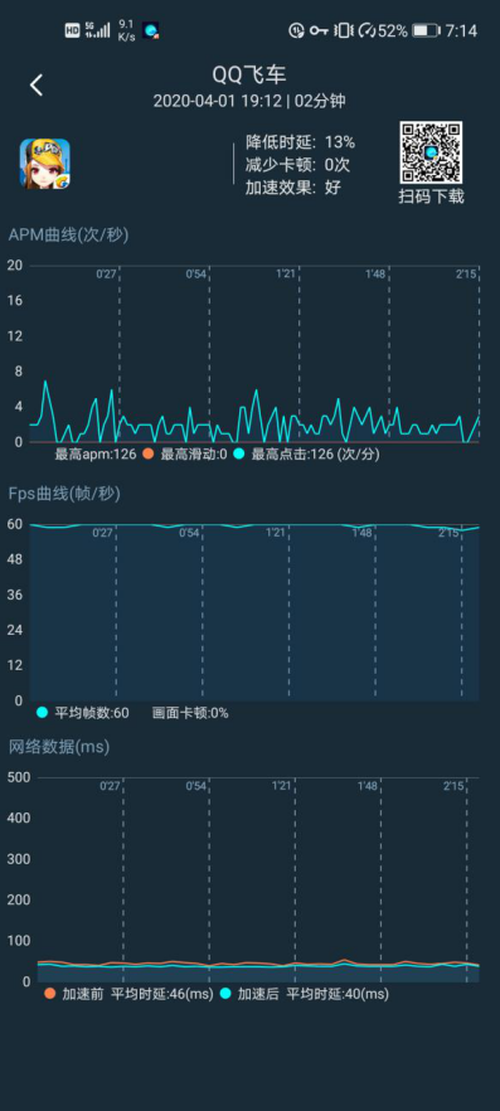 游戏记录显示,使用荣耀30S玩《QQ飞车》的平均帧率稳定在了60帧,网络时延低至40ms。在游戏过程中,画面流畅,并没有出现卡顿的情况。
