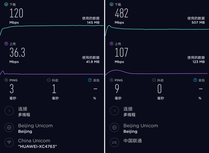 左为WiFi环境下网络数据,右为5G环境下网络数据