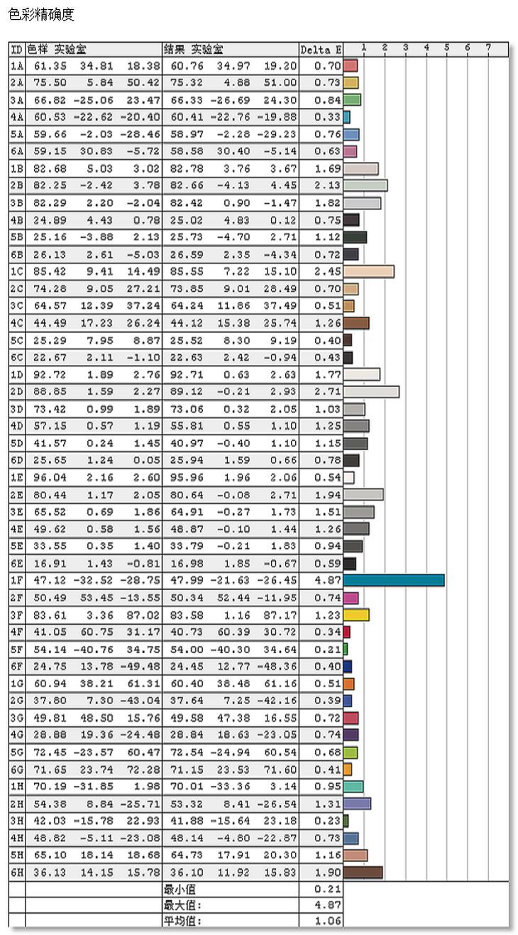 平均△E为1.06,△E≥3的颜色只有一种。显而易见,这块屏幕的色彩精准度也是相当不错的。