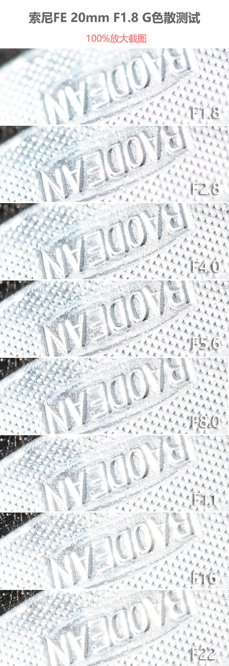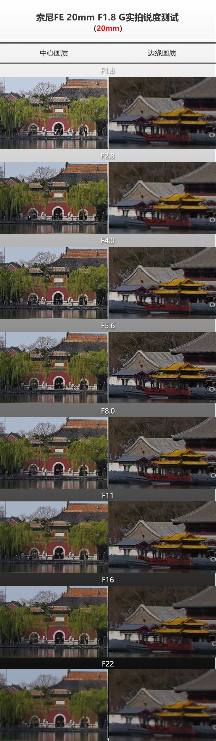 从以上实际测试以及100%放大截图来看,索尼FE 20mm F.8 G镜头的表现依然继续保持了G镜头高分辨率高锐度的特性,在整个光圈覆盖范围内都保持着不错的分辨率,即便在F1.8最大光圈下边缘画质稍稍偏肉,但中心画质拥有非常高的分辨率,而整体画质在F5.6光圈是达到非常好的,无论中心还是边缘都非常清晰锐利;同时,镜头在F8.0-F16这样的小光圈下的画质也有不俗表现,这也非常符合这支镜头的定位,因为大多数情况下拍摄风光都使用的是比较小的光圈。索尼FE 20mm F.8 G的高画质表现,主要得益于出色的光学设计以及2枚AA高级非球面镜片和3枚ED低色散镜片这些特殊镜片的运用。