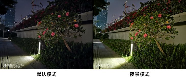 在夜拍部分,荣耀Play4T Pro支持夜景模式,实际测试发现夜景模式带来的效果提升非常明显。默认模式下画面整体曝光不会特别激进,开启夜景模式后画面整体亮度会有较大提升,暗部的细节要丰富很多,而高光部分仍旧得到控制,画面纯净,整体观感相当不错。