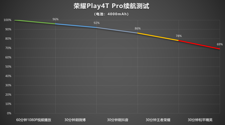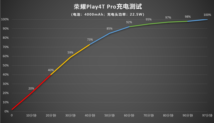 荣耀Play4T Pro配备了4000mAh电池,与之搭配的为22.5W快充,具体表现我们进行了实测。