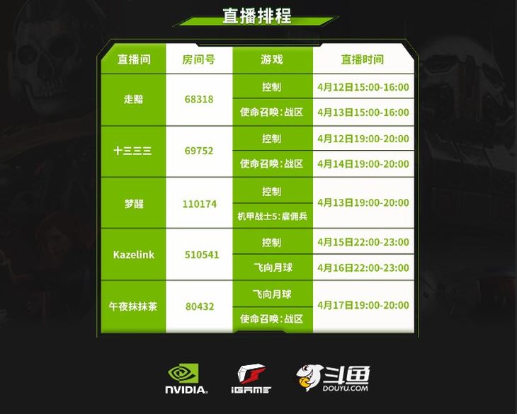 同时GeForce RTX 20 SUPER系列显卡的出世,再次壮大NVIDIA游戏GPU阵容。经过近一年的架构和流程优化,相较于其他游戏GPU,全新GeForce RTX SUPER 系列GPU提供更快游戏性能以及更好的能效比。在当下电竞游戏热潮下表现出色,譬如GeForce RTX 2060 SUPER在4K画质下可以100帧爽玩DOTA2等竞技类游戏,让玩家尽享高品质游戏画面带来的乐趣,光追游戏性能则更加给力。多的不说,留给大家届时自己体会,最后附上主播及直播间信息如下图,4月12日iGame捧着豪礼等你来嗨!