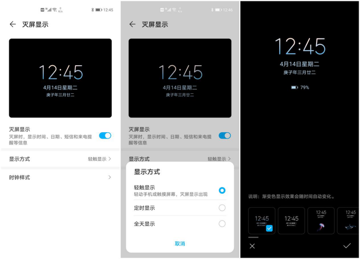荣耀30 Pro+加入了熄屏时钟,即使不开启屏幕,也能够查看时间、通知等信息,简化了用户使用手机的步骤。