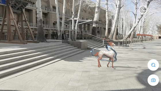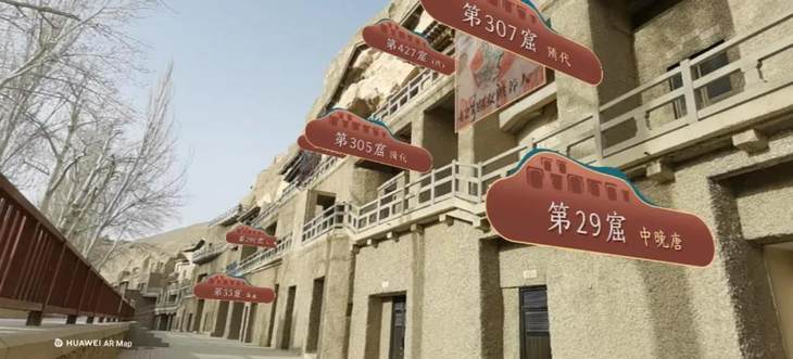 得益于华为的AR技术,往常静态的地标建筑也活灵活现起来。比如莫高窟的标志景点九层楼,在AR的加持之下,竟然还有了“佛光万丈”的惊艳“透视”效果。