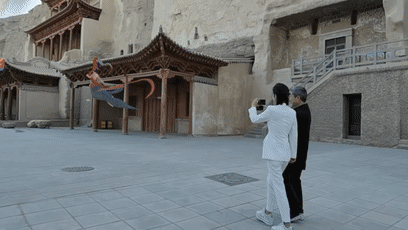 栩栩如生的“九色鹿”、美轮美奂的“飞天”,这些平时隔着屏幕才能在影视作品中看到的敦煌知名文物形象,就这么如同现实一样出现在主持人的眼前,你甚至还可以和它们来一张亲密合影。