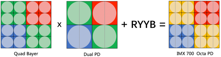 IMX700拥有5000万像素,每个像素都包含两个光电二极管(DualPD),支持双核对焦技术。在默认拍照模式下,IMX700是将四个小像素合成一个大像素,这样一个大像素就支持8核对焦,让手机的对焦速度更快。即使是在暗光环境下,依然可以保持较快的对焦速度。