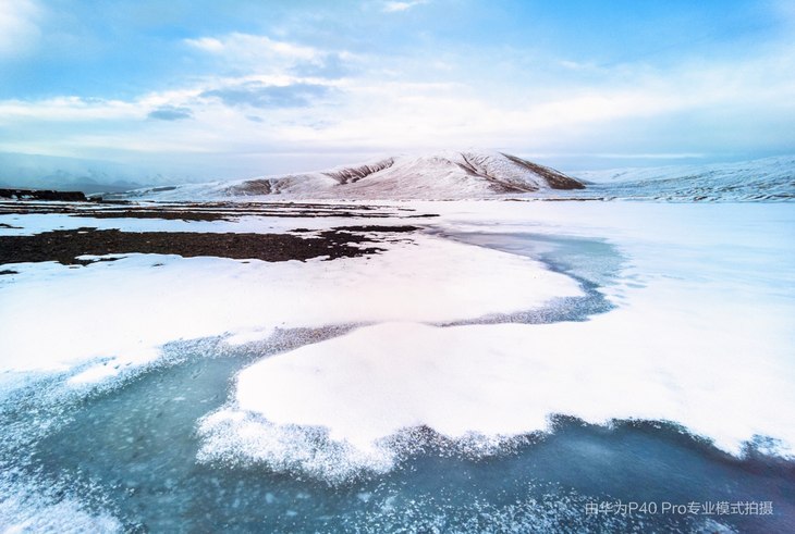 图说:豹子峡外围,随着天气逐渐转暖,冰雪覆盖的湖面开始解冻。使用华为P40 Pro Pro广角镜头拍摄,囊括了更多画面内容,将河流的S弯尽览画面中。