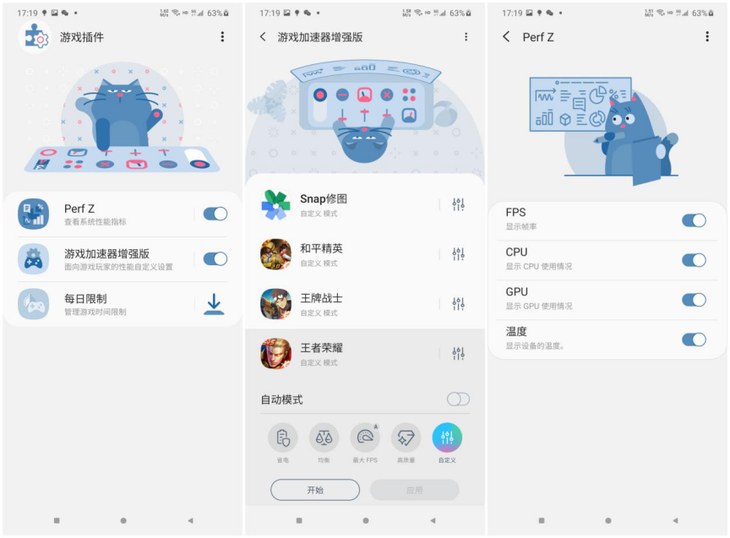 通过添加游戏插件,三星S20 Ultra还可以针对不同的游戏进行模式的选择,例如我们在游戏时可以选择最大帧率模式,或者高画质模式,从而提升游戏的体验。另外我们还可以实时查看游戏的数据,包括帧率、CPU、GPU、温度的信息。
