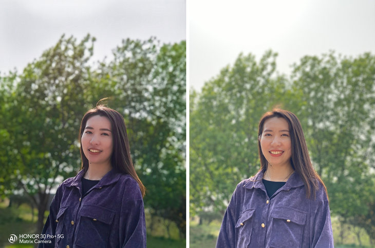 在逆光场景下,iPhone11 Pro Max整体更加明亮,而荣耀30 Pro+在人物被背景的光线处理上更加均衡。人像拍摄时相机都会优先保证面部的曝光和细节,在此基础上再来调整周围的光线。上面逆光人像的对比可以看到,虽然两款相机单看人物主体光线、对比度、色彩都非常自然,但背景的高光部分,iPhone11 Pro Max丢失比较多,而荣耀30 Pro+还能清晰还原背景天空与树枝的层次。