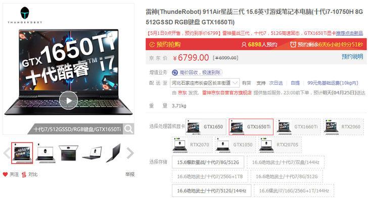 全屏幕轻薄设计 雷神911Air星战三代游戏本预约到手价6799元