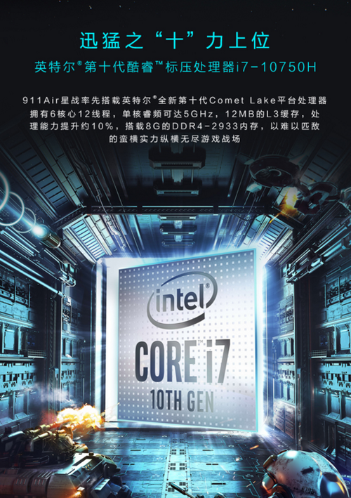 在核心配置方面,雷神911Air星战三代搭载了酷睿i7-10750H,这款处理器是第十代智能英特尔酷睿H系列移动处理器的中高端型号,拥有6核心12线程设计,基础频率2.6GHz,睿频更是高达5.0GHz,为畅快游戏进一步加油。