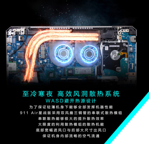 将强大的硬件配置设计在了轻薄的机身里面,这对散热设计自然也有着更高的要求。雷神911Air星战三代采用了高效风洞散热系统,配备有双风扇三铜管,能够提供出色的散热性能,令这款游戏本在工作中更稳定,更清凉。