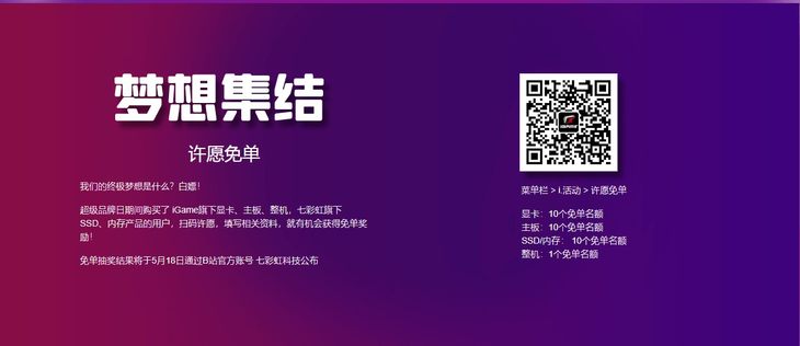 5月7日,iGame超级品牌日正式启动。本次超品日,iGame为大家准备了超多福利:非常给力的优惠政策,以旧换新,超值赠礼等你拿!如果这些都不算什么,那还有超多免单等你抽!只需要一点点欧气,以上全部即可到手。下面就让我们一起来看看具体的的活动都有啥,保证有些适合你!活动链接:https://www.colorful.cn/event/iGame_day/index.html