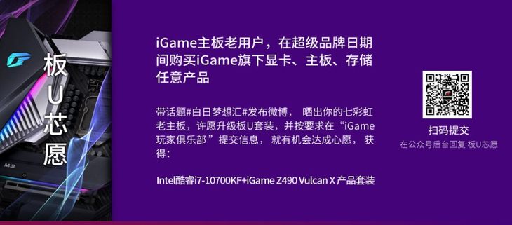 而在主板方面,iGame超级品牌日期间,消费七彩虹主板、显卡、存储的七彩虹主板老用户,参与#白日梦想汇#话题,晒出你的七彩虹老主板,许愿升级板U套装,并按要求在“iGame玩家俱乐部”提交信息,我们将随机抽选3名用户,帮你达成心愿升级成Intel酷睿i7-10700KF+iGame Z490 Vulcan X。只需要关注“iGame玩家俱乐部”,在公众号后台回复“板U芯愿”根据要求填入信息即可。
