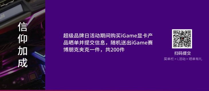 iGame超级品牌日期间购买iGame显卡产品晒单并提交信息,随机送出iGame赛博朋克甲可一件,共200件,送完即止。