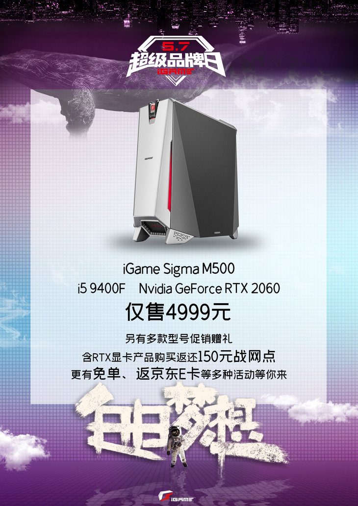 5月1日至5月8日iGame品牌日活动期间购买iGame G-ONE游戏一体机全系列晒单返1000元购物券(京东E卡、天猫代金券),如购买iGame G-ONE(i7+RTX 2060)机型另外即赠送价值1999元乐歌E2电动升降桌,购买iGame G-ONE(RTX 2080)机型即赠送价值4500元梦想游戏场景改造设备【傲风电竞桌椅套装,雷蛇毒蝰鼠标、雷蛇萨诺狼蛛幻彩版游戏键盘、北海巨妖7.1?耳机外设套装】,活动详情详见七彩虹京东官方旗舰店。