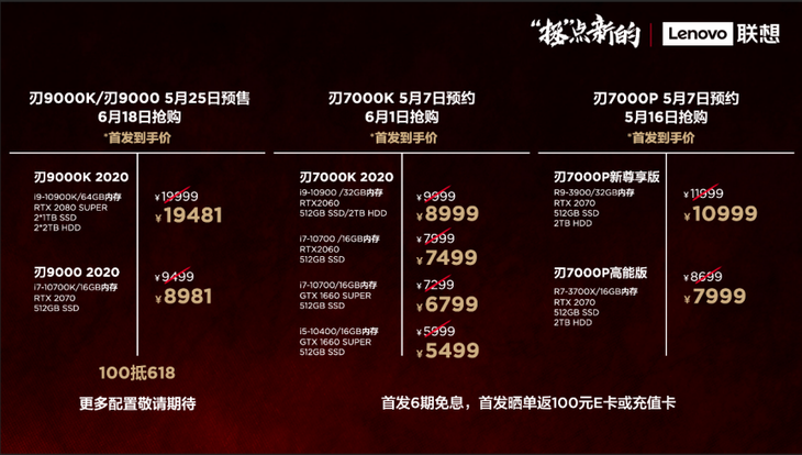 台机产品拯救者刃9000K/刃9000电脑5月25日预售,6月1日抢购,先发到手价分别为19481元、8981元,拯救者刃7000K电脑 5月7日预约 6月1日抢购,先发到手价5499元起,拯救者刃7000P 电脑5月7日预约 5月16日抢购,先发到手价7999元起。同时,联想滑板车M2同步开售,先发到手价仅1699元。