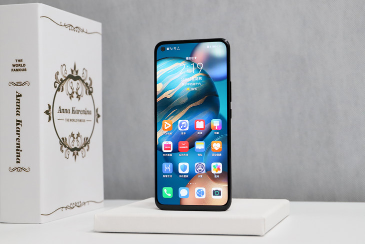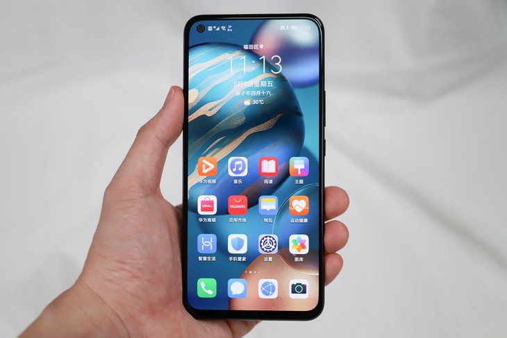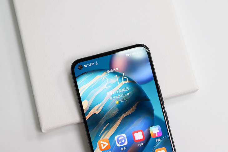 荣耀30配备了一块6.53英寸的OLED魅眼屏,和其它两款不一样的是,荣耀30采用的是传统直屏设计,完全不用担心屏幕边缘的误触问题。屏幕四边框都非常窄,略宽的下边框也得到尽可能缩小,整体视觉效果非常好,屏占比达到91%。
