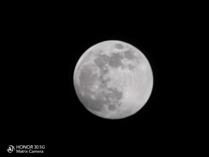 对了,通过荣耀30还可以拍月亮。当系统检测到你在拍月亮的时候,会自动进入月亮模式,超长焦搭配算法上的优化,你可以拍到一个很美的月亮,有空拍拍月亮也是挺有意思的。