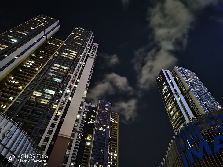 在部分夜拍场景下,荣耀30的夜景模式不会对画面整体提亮,主要是压制高光,提升照片质感,应该跟不同场景下的算法优化有关。