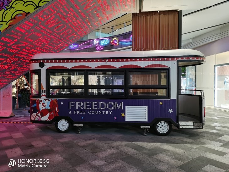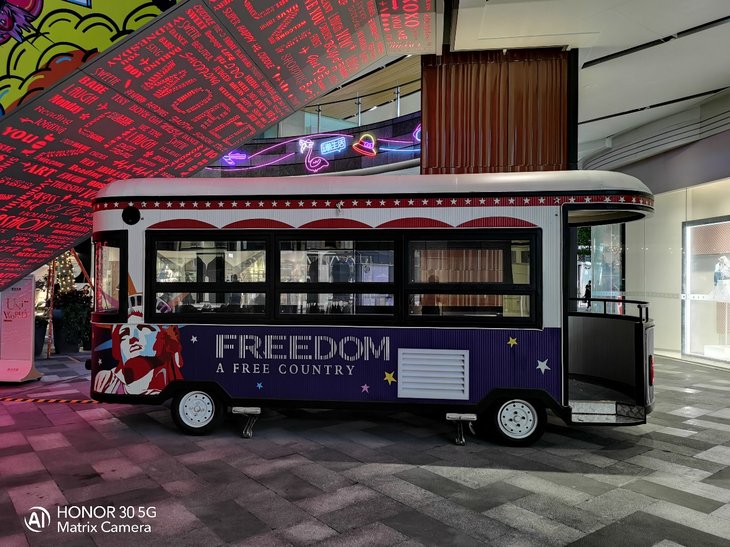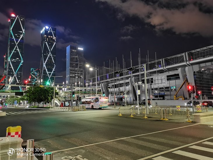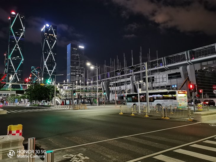 荣耀30的夜景算法还针对移动物体进行优化,在上面夜景样张的拍摄过程中,画面的公交车是处于移动状态的,夜景模式的实际成片并没有因为公交车的移动而出现一片残影,能够轻松应对这种特殊情况。