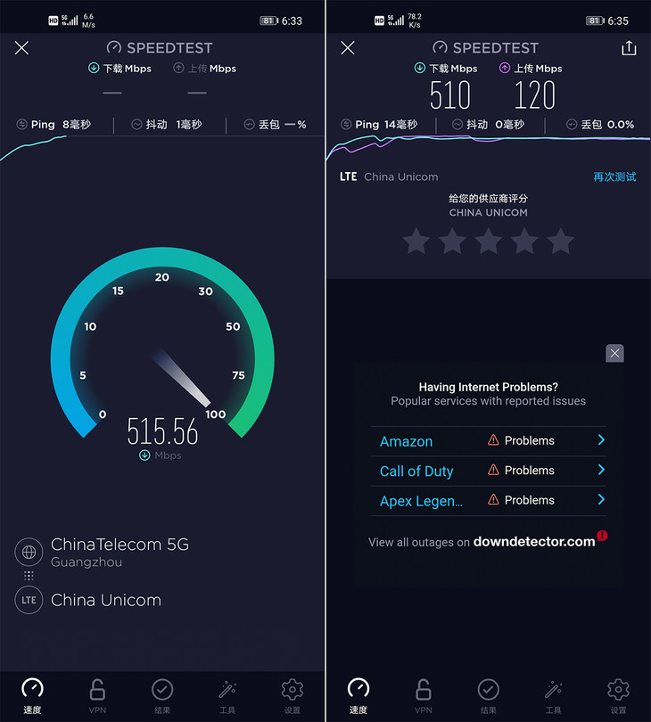 网络部分,麒麟985集成5G基带,支持SA/NSA双模5G六频段,对5G网络的支持更加全面,略为遗憾的是不像其它两款机型一样支持WiFi 6+。荣耀30能够带来稳定高速的5G网络体验,从上面的测速结果可以看到,荣耀30可以轻松达到510Mbps的下载速度(5G套餐限制为500Mbps),上传速度为120Mbps,日常下载、在线看高清视频等场景都够感受到速度的提升。