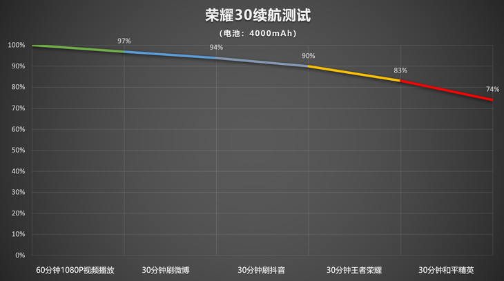 实际续航测试结果如上图,在线播放一个小时1080P视频耗电仅为3%,刷微博30分钟耗电3%,刷抖音30分钟耗电4%。在游戏环节,全特效玩30分钟《王者荣耀》耗电7%,30分钟《和平精英》耗电9%。经过3个小时的重度测试,最终剩余电量为74%,在同样电池容量的5G手机中,这样的续航表现已经非常优秀。对于大部分上班族来说,应对一天工作日应该是没啥压力的。