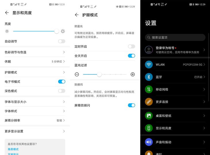 值得一提的是,荣耀30提供了丰富的显示模式可供选择,包括深色模式、电子书模式等。电子书模式下,通过对屏幕色温、亮度、灰度的控制,实现类似墨水屏的显示效果,这种效果是全局的,不用担心APP的适配问题,能够缓解视觉疲劳,带来更舒适的观看体验。荣耀30还支持护眼模式,可调节不同等级的蓝光过滤效果,支持防频闪功能等,这些都能更好保护眼睛。